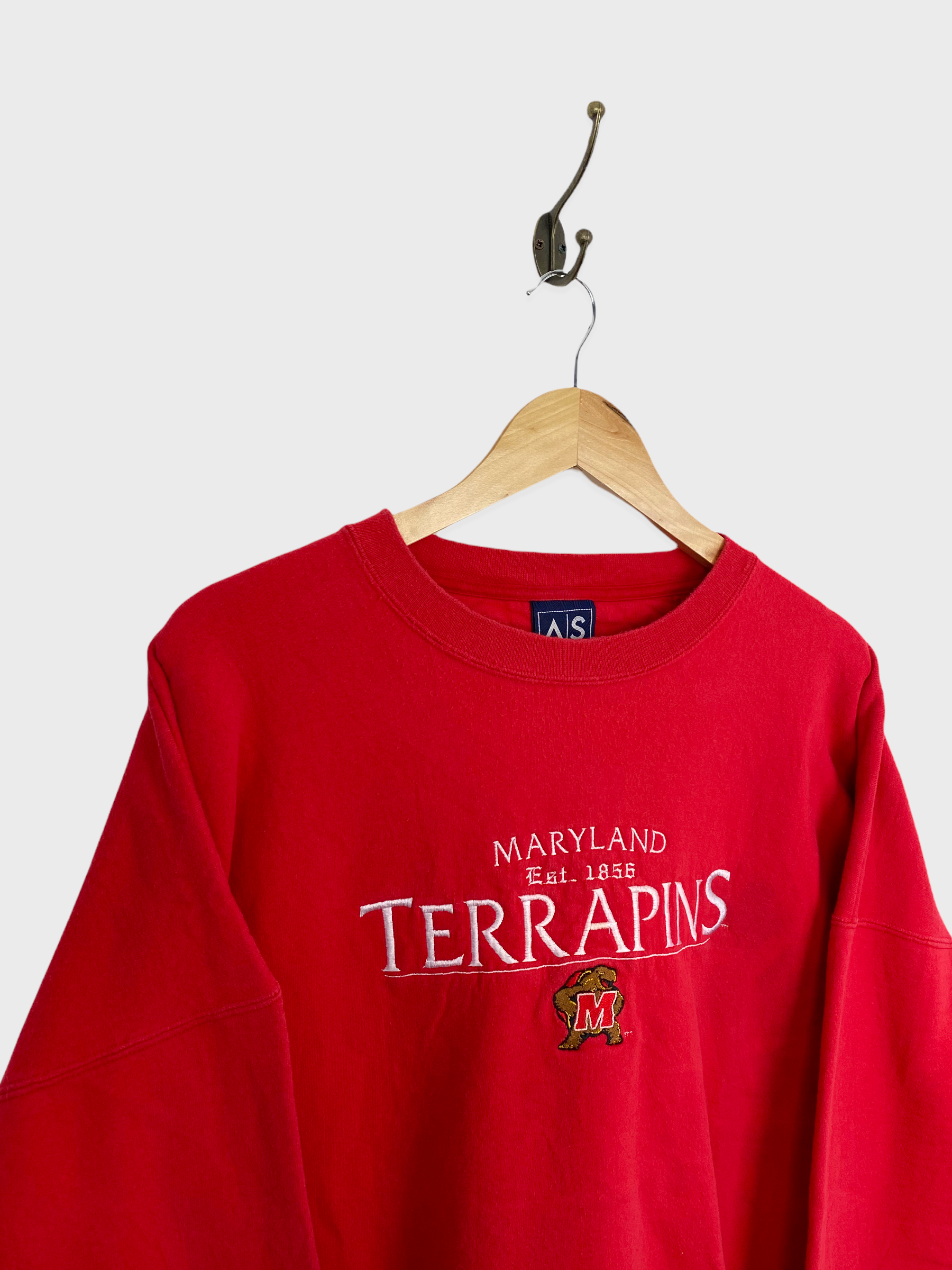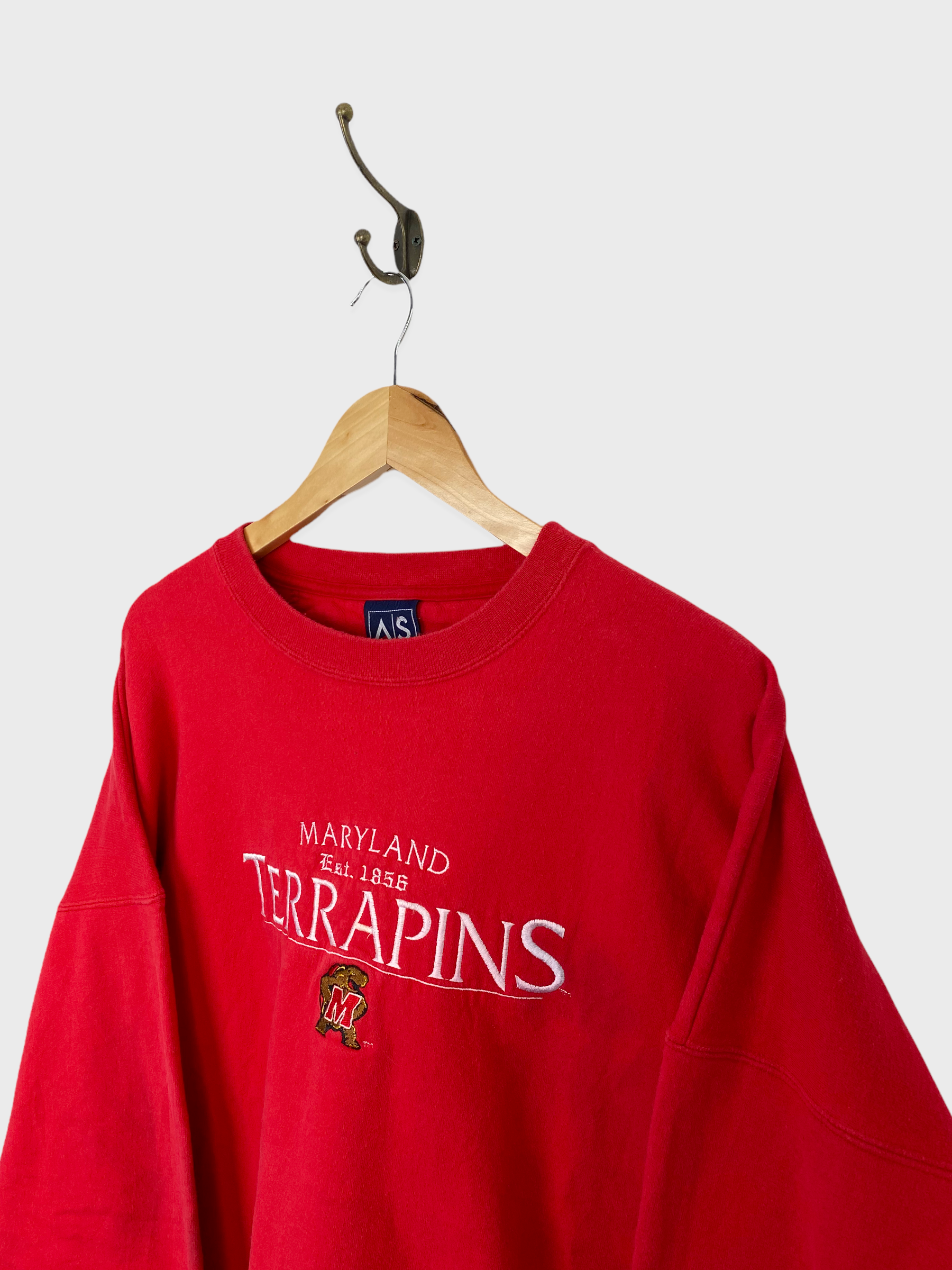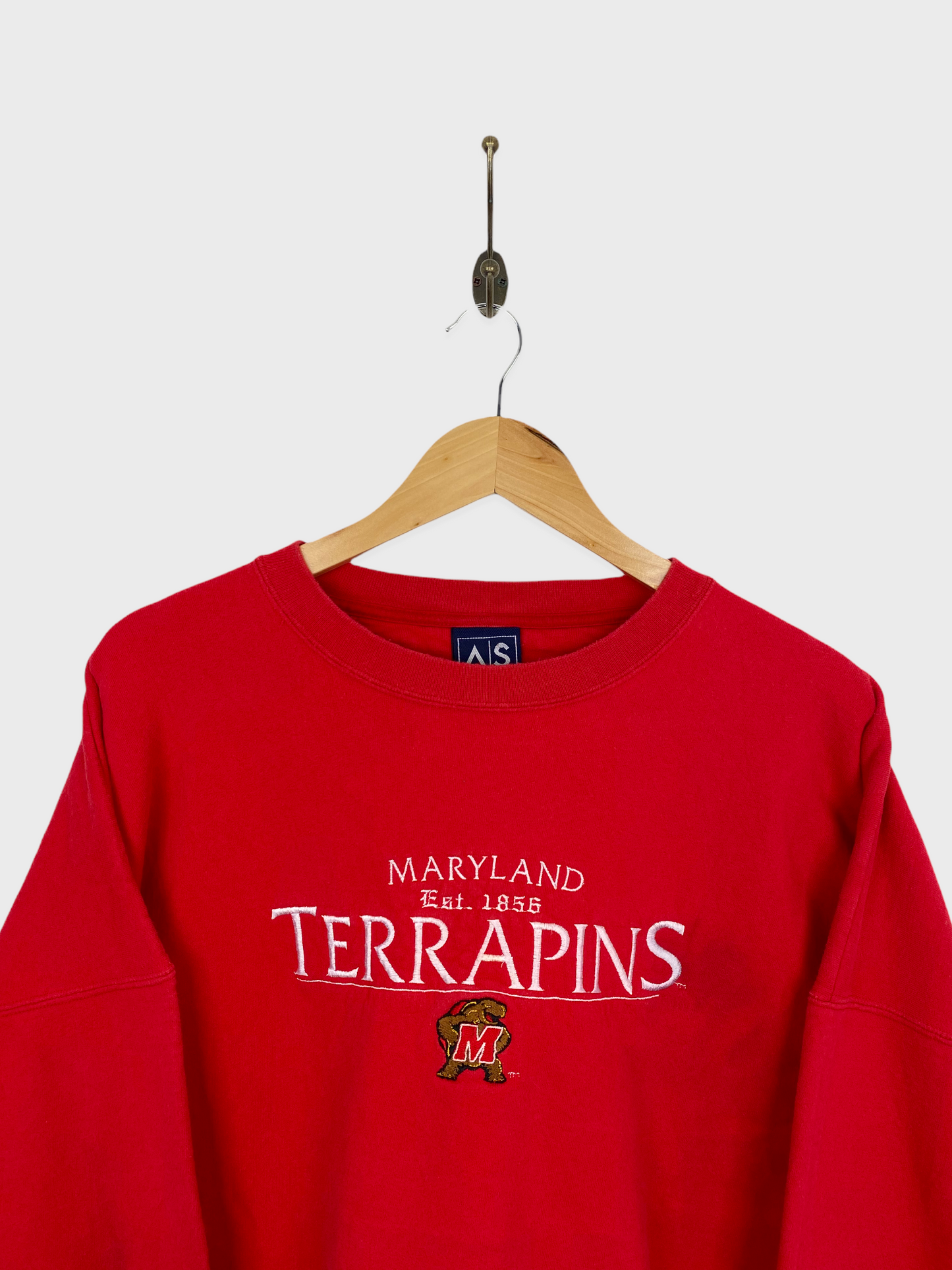 90's Maryland Terrapins Embroidered Vintage Sweatshirt Size XL-2XL. A unique vintage University Sweatshirt. Mens Size XL-2XL. In Red. Embroidered. The condition of this item is 8/10 Mark on the arm pictured